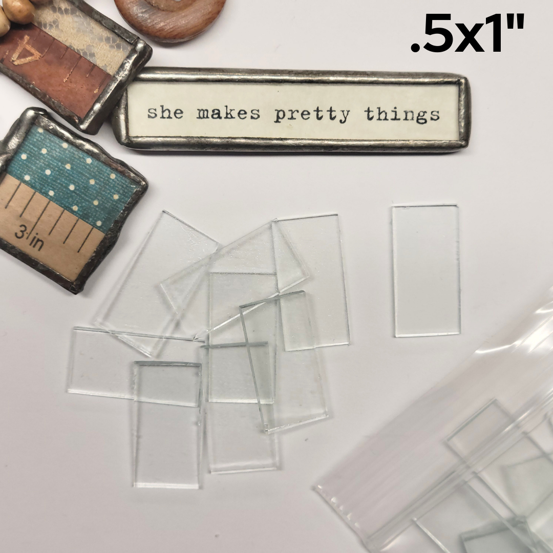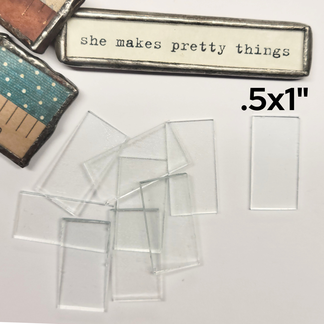 Discover our versatile .5 x 1 Inch Flat Glass Rectangles, perfect for a wide range of crafting projects. Sandwich pictures, cloth, flower petals, text/words/names, and more in between 2 pieces of glass. Make your own Assemblage jewelry or soldered art pendants. Crafted with precision, these clear glass rectangles are flat on both sides, making them ideal for various techniques.