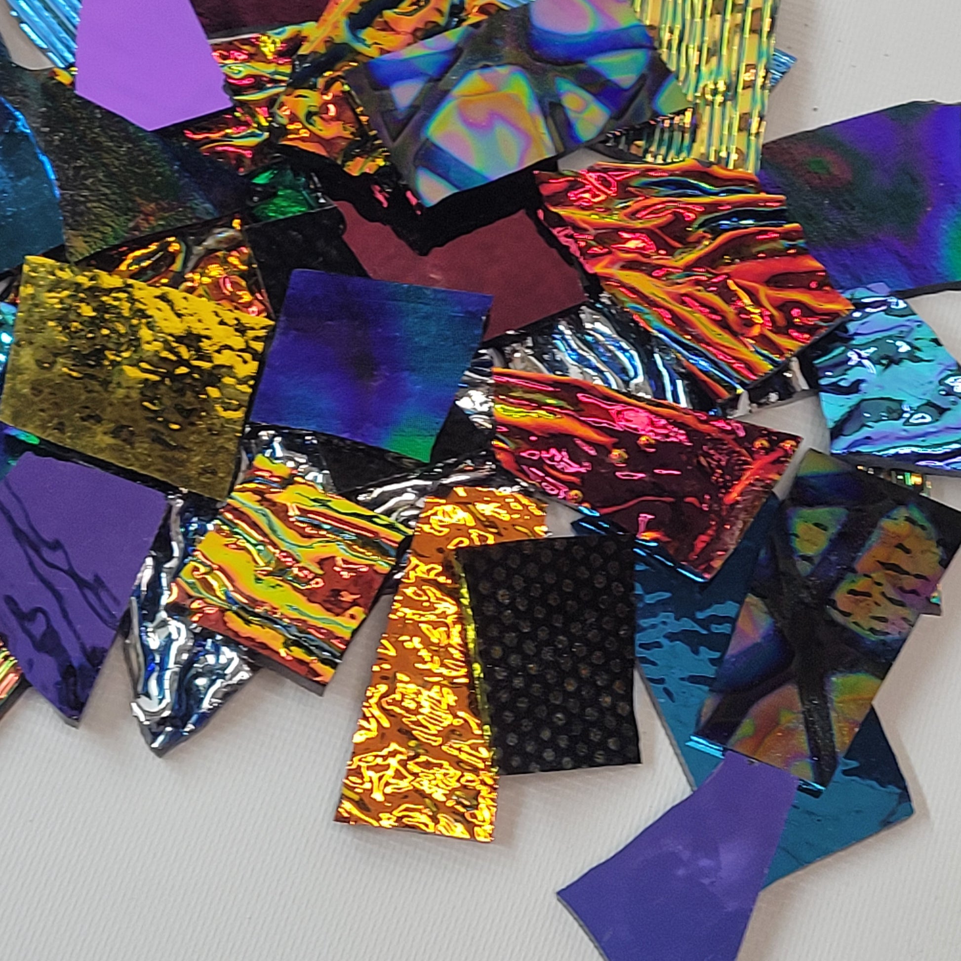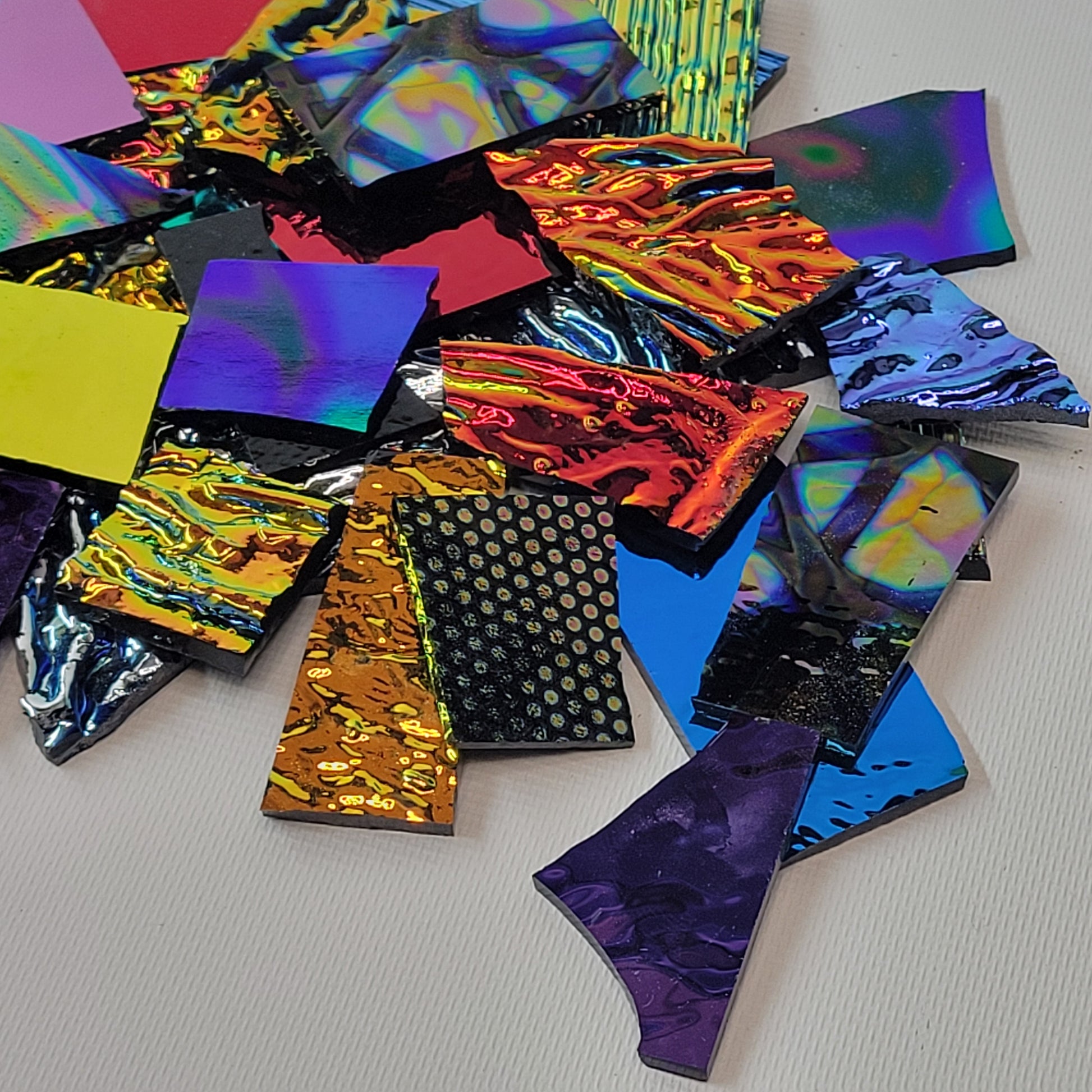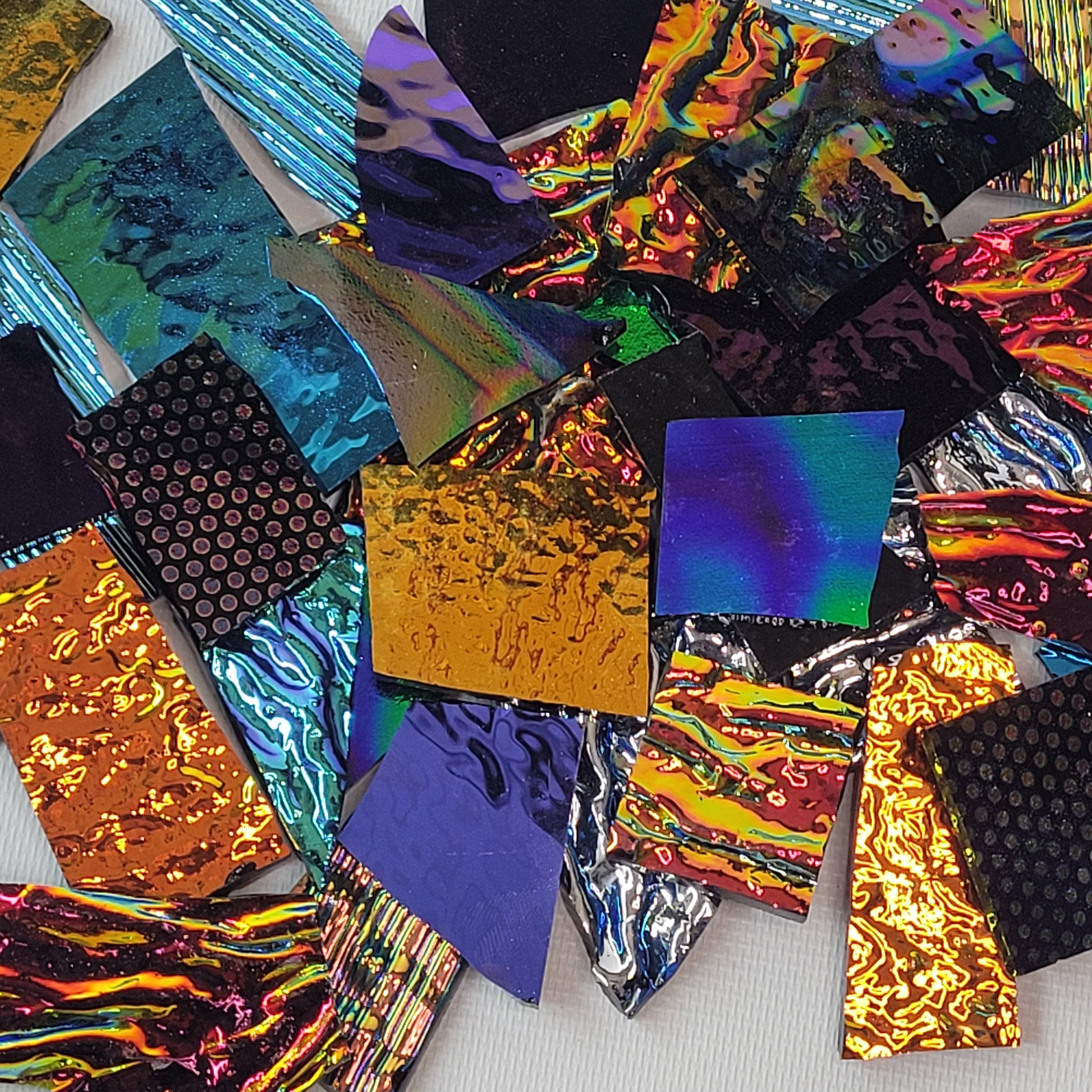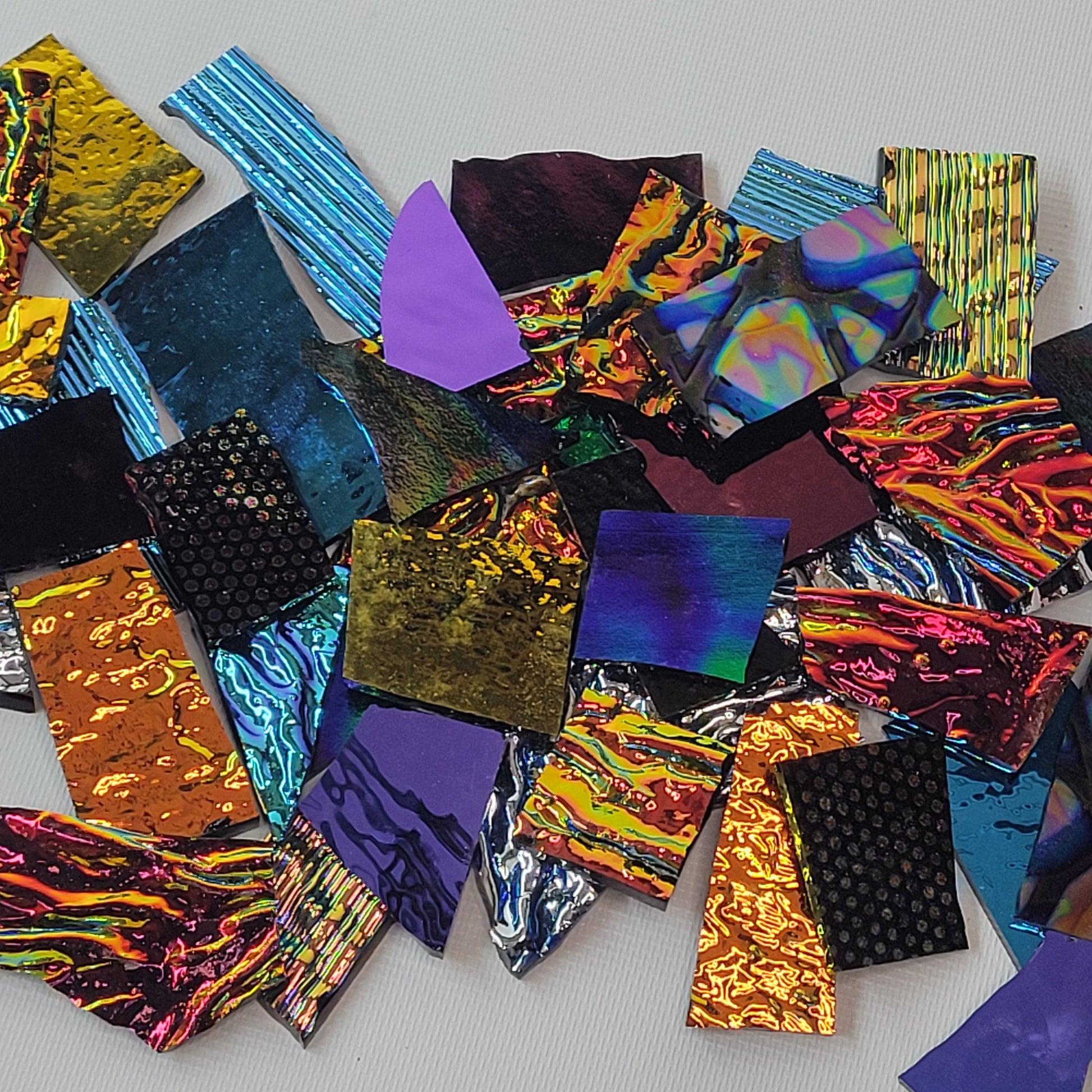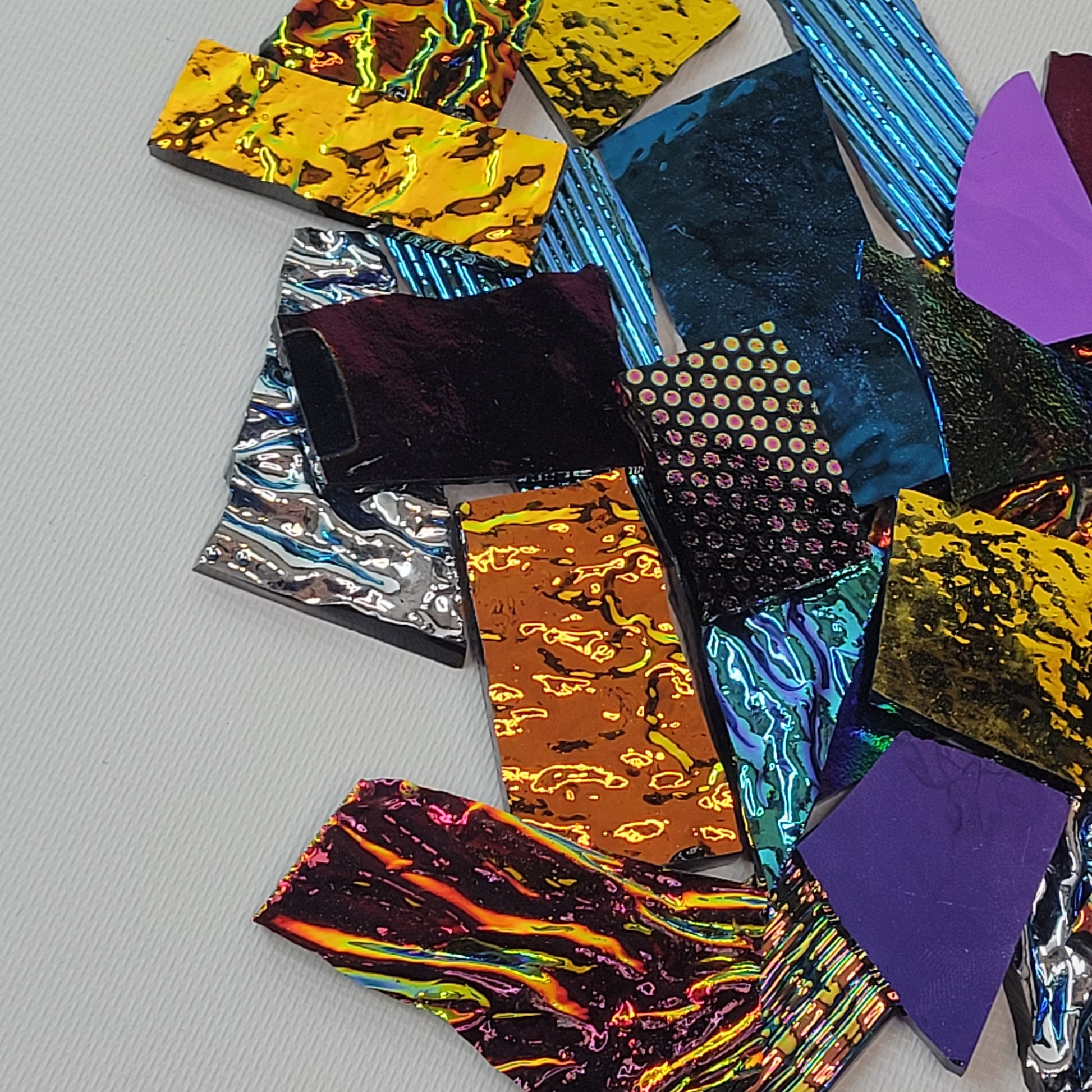 3 oz of Dichroic Glass Scrap Pieces: Sold by weight, you’ll receive a unique assortment of dichroic glass scraps, offering a variety of dazzling effects and colors.