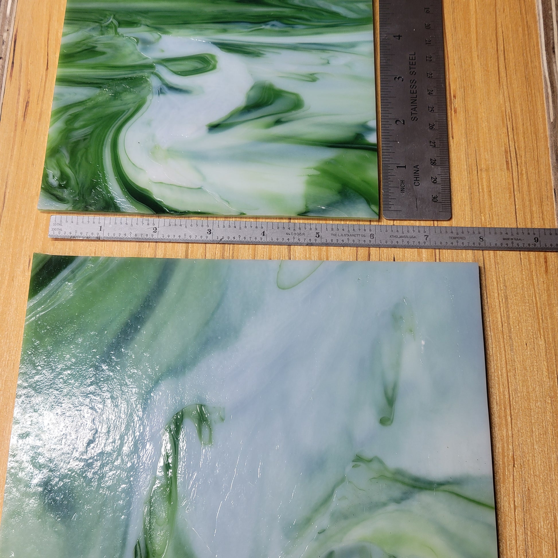 This Fern - Dark Green Opal Wispy Stained Glass by Wissmach features a deep, rich green base with flowing opalescent wisps, creating a natural and elegant look. Each sheet measures 6 x 8 inches (approximate, with a 1/8" tolerance), making it perfect for stained glass projects, jewelry making, mosaics, panels, and more.