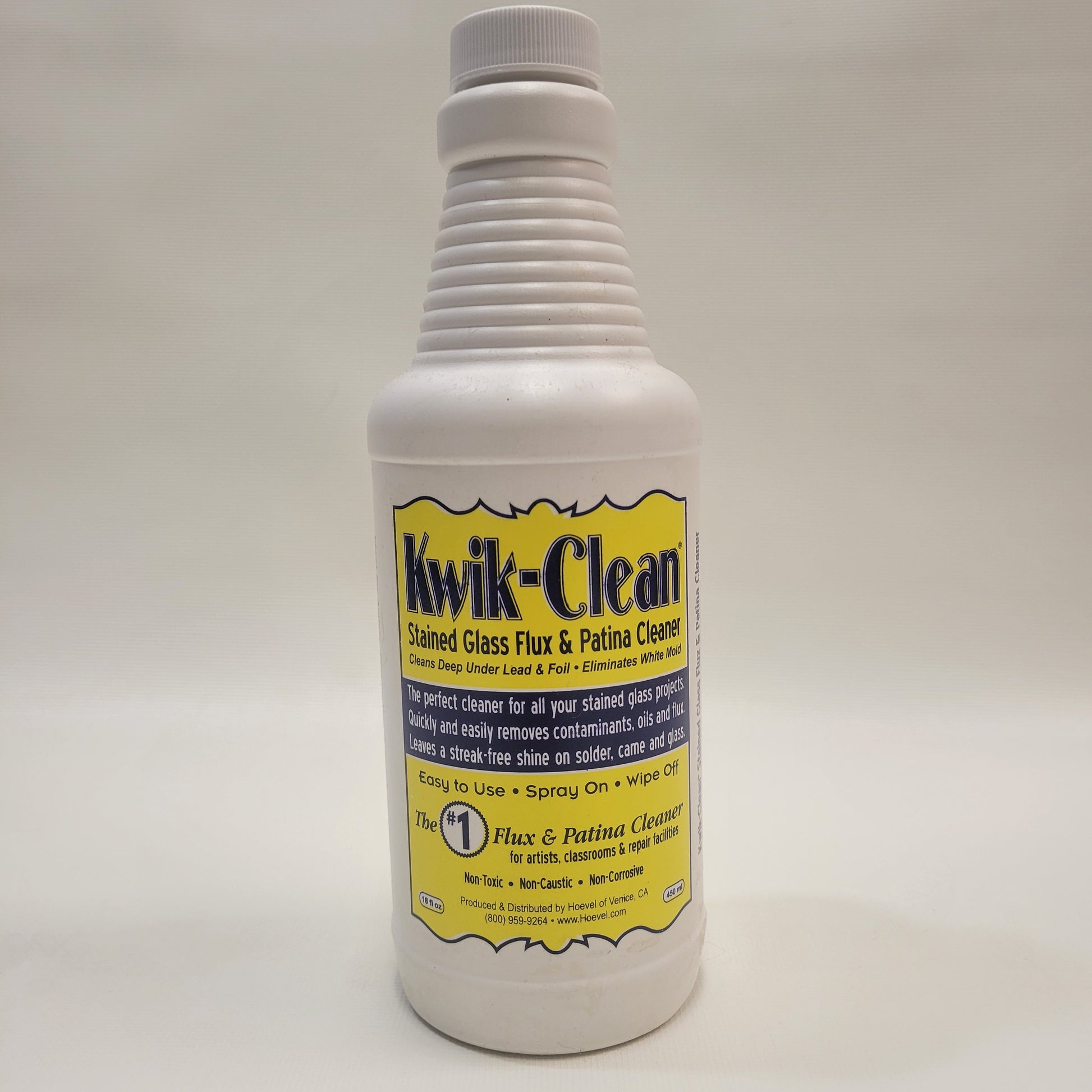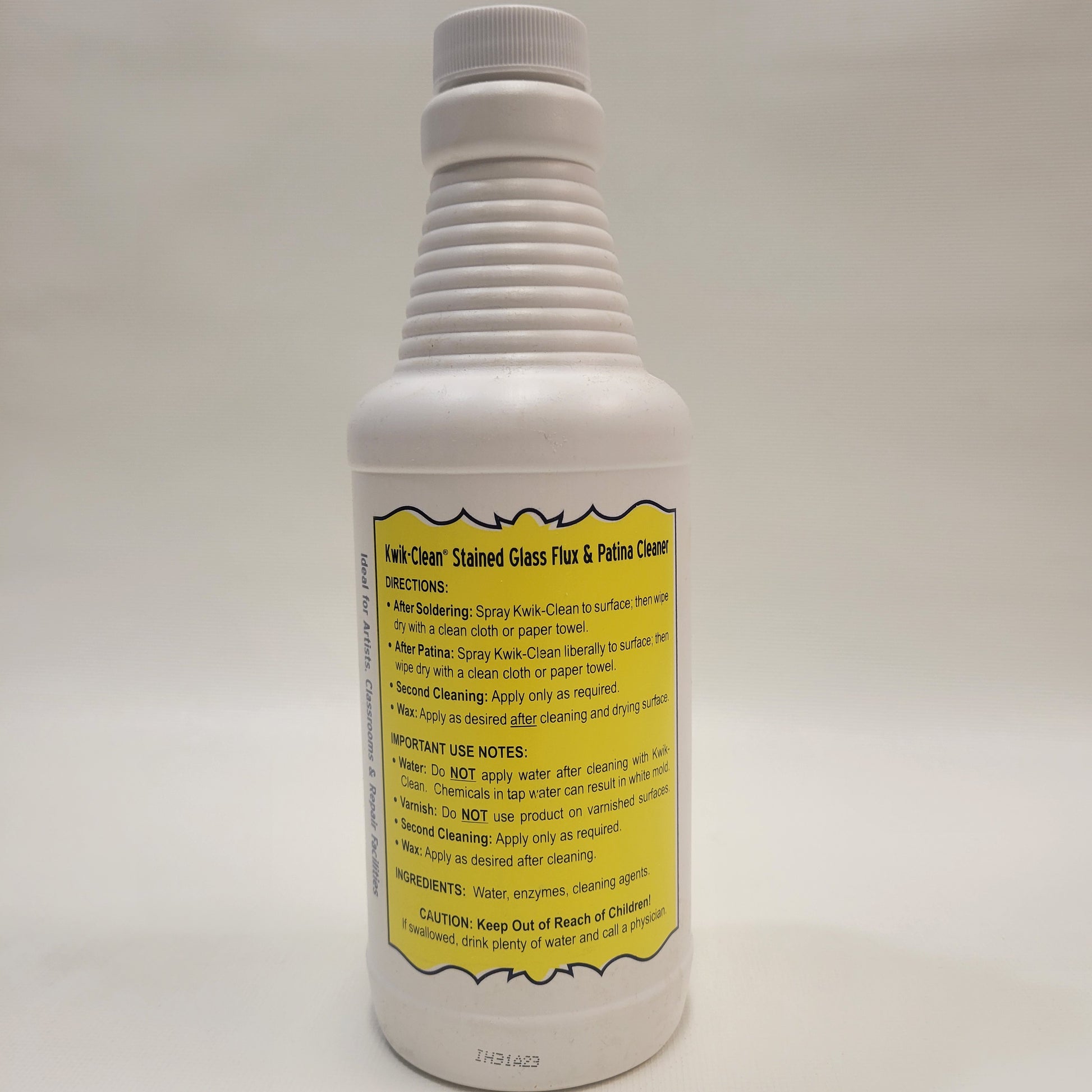 Kwik-Clean - Flux & Patina Remover (16 oz / 450 ml) Spray Bottle is the perfect solution for cleaning stained glass and soldered projects with ease. This non-toxic, water-free formula is designed to effectively remove flux residue and neutralize excess patina, keeping your projects pristine and professional-looking. Simply spray it on and wipe it off—no water needed, so you won’t risk damaging your glass.