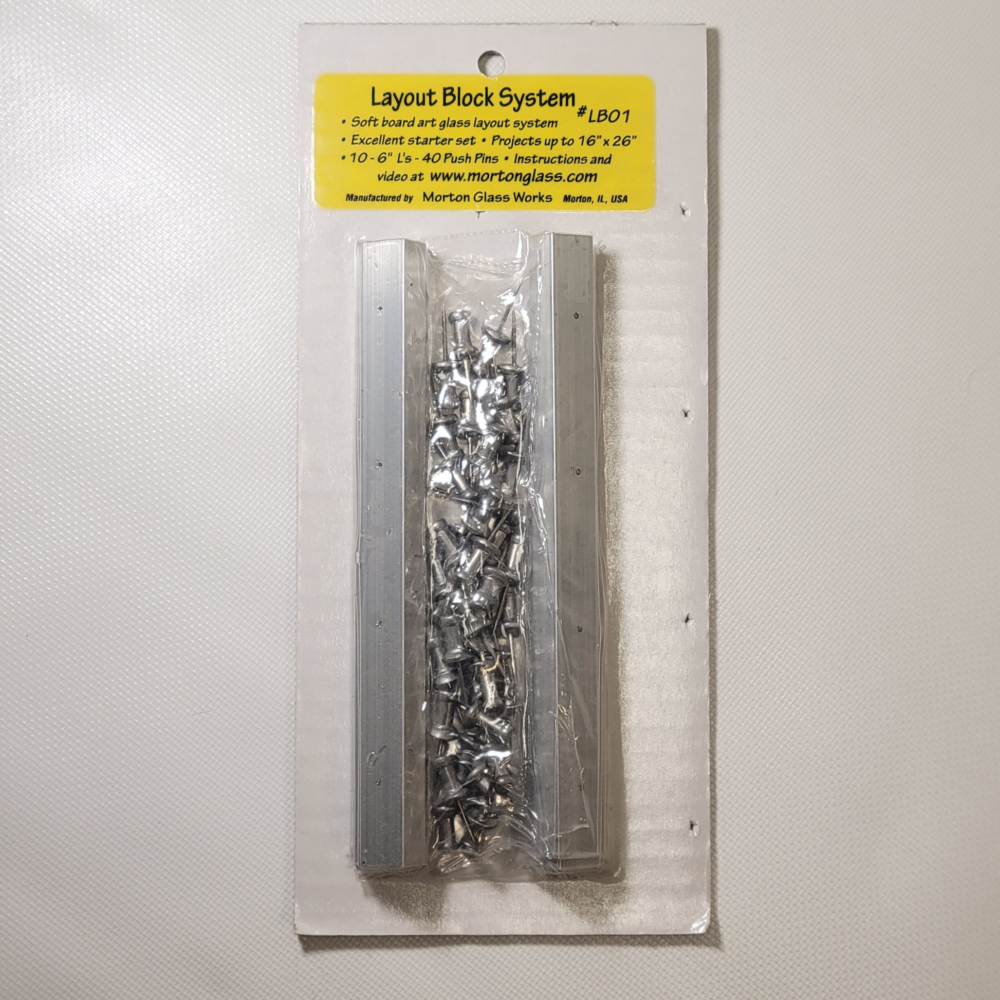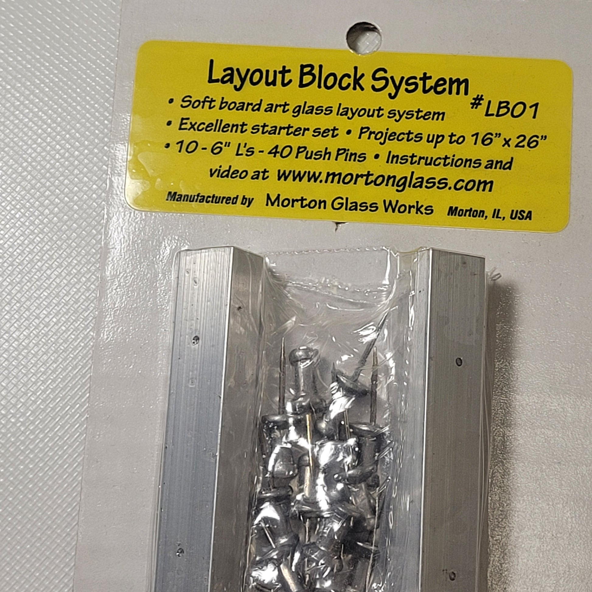 The Morton Layout Block System is an innovative alternative to the traditional wood strip and horse shoe nail layout board, designed to help you hold your stained glass projects securely in place while you work. This system includes ten 6-inch aluminum blocks and 40 push pins, allowing you to easily arrange and hold your glass pieces without the risk of movement during soldering. Perfect for use with inexpensive ceiling tiles, which act as your layout board and soldering surface, this system ensures a smooth, stable work surface. Additionally, you can expand your setup with the optional 12", 17", and 23" layout add-on sets for even more flexibility and larger projects. Whether you're a beginner or a seasoned glass artist, the Morton Layout Block System will make your soldering process easier and more precise.