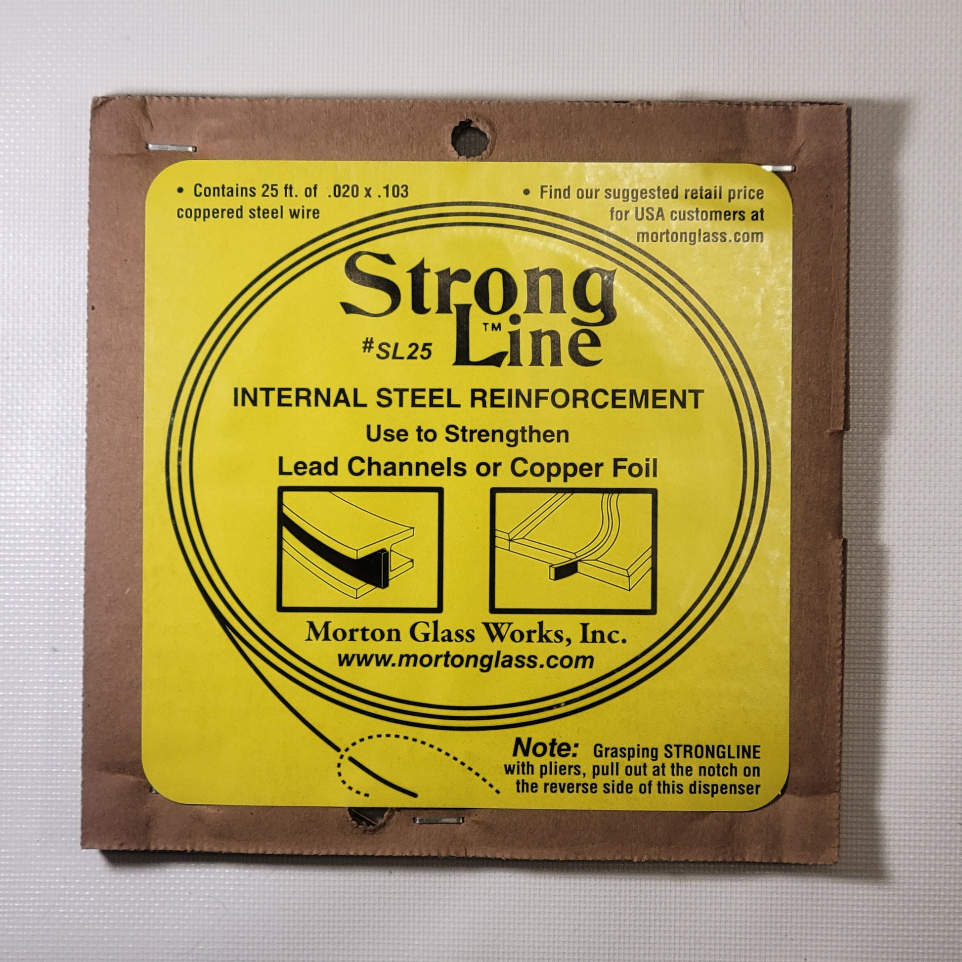 Enhance the strength and durability of your stained glass panels with the Morton Strong Line. This thin, yet incredibly strong, coppered steel strip is a must-have for anyone working with copper foil or lead came. It offers a reliable reinforcement to your glass projects, ensuring long-lasting results without the need for external bars.